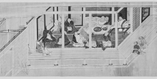 - 庭で作業(洗濯,洗い張り)する下女