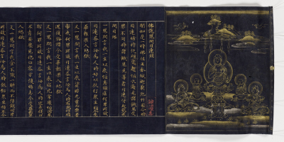 | 品質・構造・形状 | 紙本 楮紙 紺紙 金泥書 見返絵(金泥 銀泥) 巻子 / 銅製 鍍金(軸) | ||||||