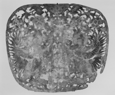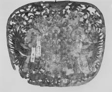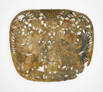 | 品質・構造・形状 | 革製 牛皮材 彩色 金泥 透彫 団扇形 宝相華文 迦陵頻伽文 |