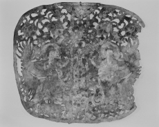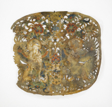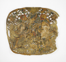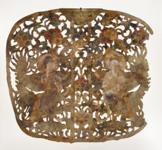 | 品質・構造・形状 | 革製 牛皮材 彩色 金泥 透彫 団扇形 宝相華文 迦陵頻伽文 |