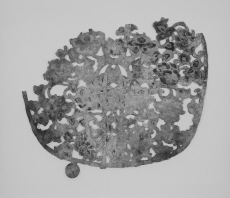 | 品質・構造・形状 | 革製 牛皮材 彩色 金泥 截金 透彫 団扇形 宝相華文 | ||||||