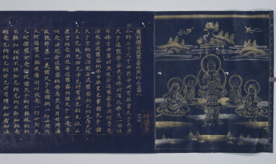 | 品質・構造・形状 | 紙本 楮紙 紺紙 金泥書 見返絵(金泥 銀泥) 巻子 / 銅製 鍍金 (軸) | ||||||