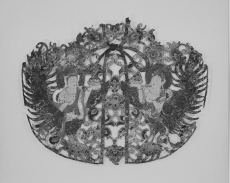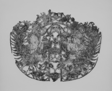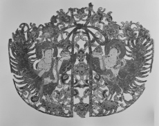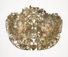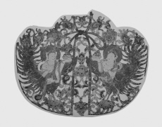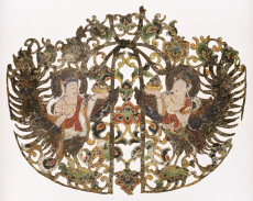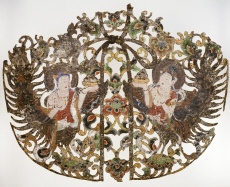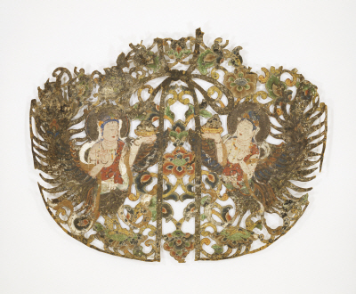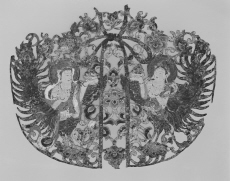 | 品質・構造・形状 | 革製 牛皮材 彩色 金泥 截金 透彫 団扇形 宝相華文 迦陵頻伽文 |