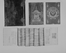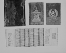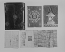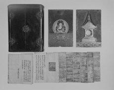 | A026710 | 厨子軸部(上部画面から切れる)、内部板壁2枚(宝篋印塔、如来彩絵面)、納入経8帖分 | 4×5 | モノクロ | |