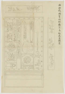 | 名称(漢字) | 図案 初音葦手象嵌裁縫箱(木内家三代資料のうち) | ||||||